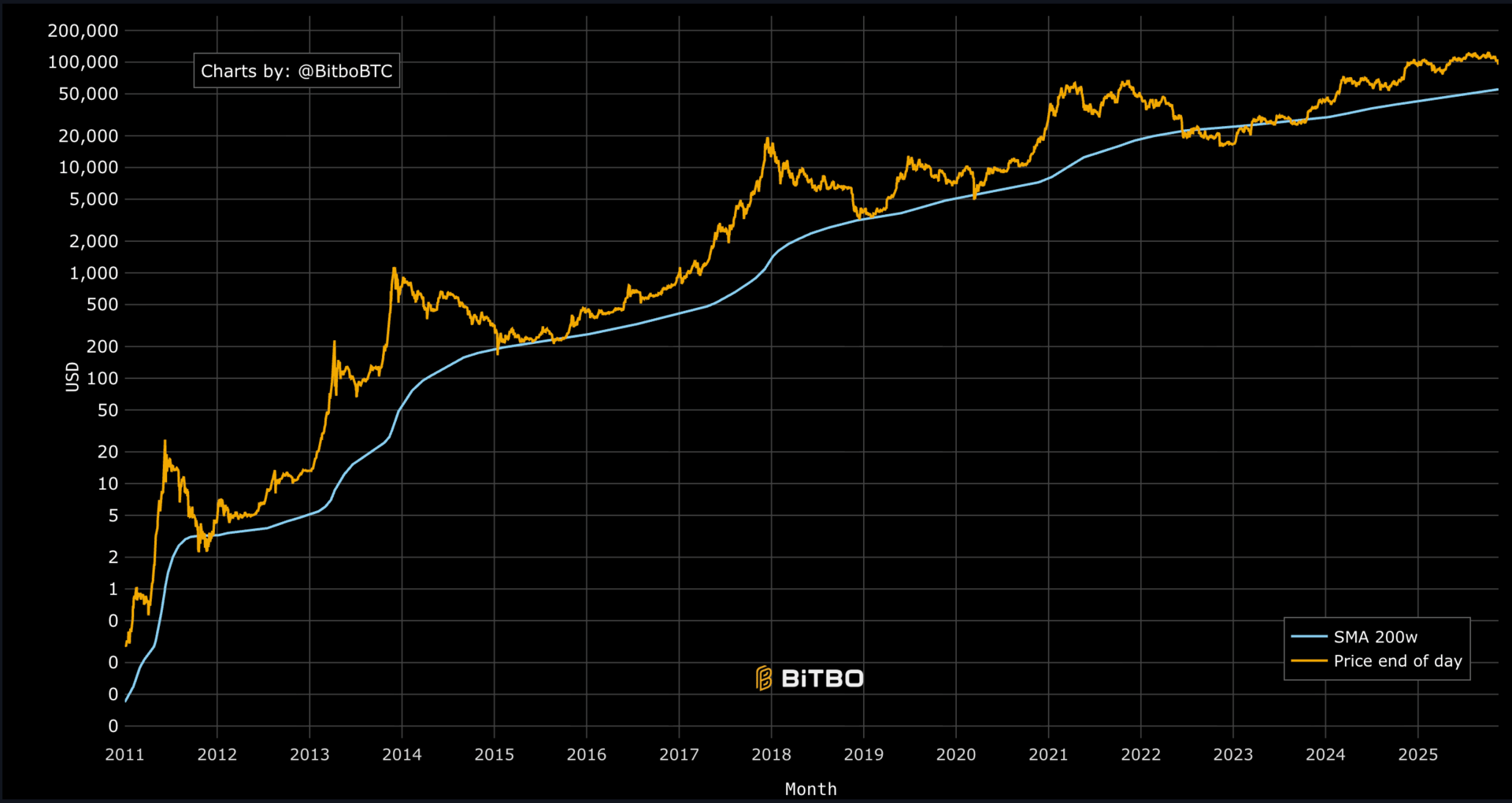 BTC 200-week simple moving average (teal line) vs price in USD (orange line). Source: BitBo.com